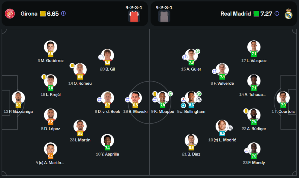 คิโรน่าเปิดเกมด้วยแผน 4-2-3-1 ที่เน้นการตั้งรับแน่นและสวนกลับ แต่ต้องเจอกับเกมรุกของเรอัล มาดริดที่มีความหลากหลายจากแผน 4-2-3-1 เช่นกัน ทีมเยือนใช้การครองบอลที่เหนือกว่า (59%) และการส่งบอลที่แม่นยำถึง 92% สร้างโอกาสเข้าทำได้หลากหลาย โดยเฉพาะการเชื่อมเกมของ เบลลิงแฮม และ โมดริช ที่ทำให้แนวรับเจ้าบ้านต้องเหนื่อยหนัก