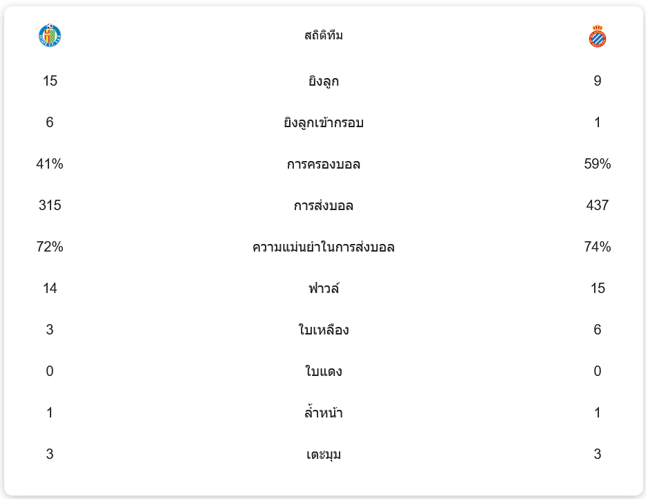 แม้ เอสปันญ่อล จะครองบอลได้ถึง 59% และมีความแม่นยำในการส่งบอลสูงถึง 74% แต่การยิงเข้ากรอบเพียง 1 ครั้งเท่านั้นทำให้พวกเขาไม่สามารถทำประตูได้ ขณะที่ เกตาเฟ่ ยิงเข้ากรอบถึง 6 ครั้งจากการยิงทั้งหมด 15 ครั้ง แสดงถึงความเด็ดขาดในจังหวะสำคัญ