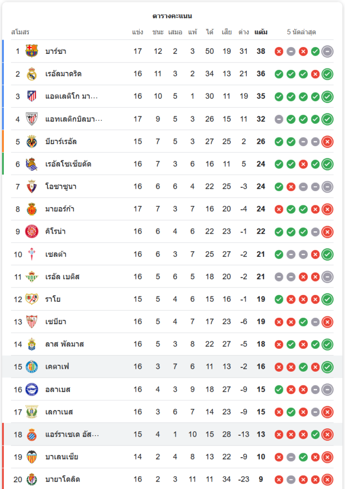 เกตาเฟ่ ขยับขึ้นมาอยู่ที่ 14 มี 18 คะแนนจาก 16 นัด ขณะที่ เอสปันญ่อล ยังคงรั้งอันดับ 18 ด้วย 13 คะแนนจาก 15 นัด และต้องเร่งฟอร์มอย่างหนักหากต้องการหลุดจากโซนตกชั้น