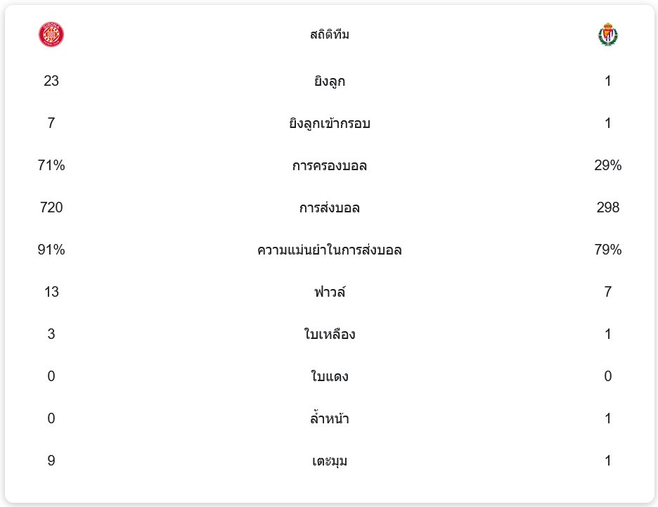 คิโรน่า ครองบอลได้ถึง 71% เทียบกับ เรอัล บายาโดลิด ที่ทำได้เพียง 29% และมีโอกาสยิง 23 ครั้ง โดยเข้ากรอบ 7 ครั้ง ขณะที่ เรอัล บายาโดลิด มีโอกาสยิงเพียง 1 ครั้ง การส่งบอลของ คิโรน่า ก็เหนือกว่าอย่างชัดเจน ด้วยความแม่นยำ 91% จากการส่งบอลทั้งหมด 720 ครั้ง