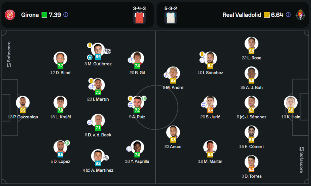 เรอัล บายาโดลิด ใช้แผน 5-3-2 ที่เน้นการตั้งรับเป็นหลัก แต่ไม่สามารถต้านทานการโจมตีที่รวดเร็วและดุดันของ คิโรน่า ได้เลย ความไม่แน่นอนในแดนกลางและการเสียบอลบ่อยครั้งทำให้ทีมเสียเปรียบอย่างชัดเจน