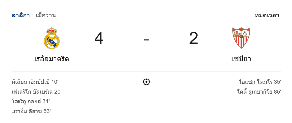 จาก : ผลบอลสด ลาลิกา 2024 ระหว่าง เรอัล มาดริด 4-2 เซบีย่า วันนี้ 22/12/67 – บ้านกีฬา