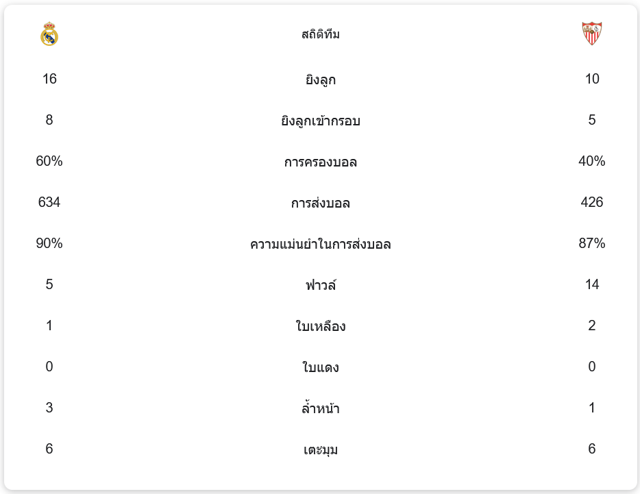 เรอัล มาดริดครองบอล 60% ยิงทั้งหมด 16 ครั้ง เข้ากรอบ 8 ครั้ง ขณะที่เซบีย่าครองบอลเพียง 40% ยิงทั้งหมด 10 ครั้ง เข้ากรอบ 5 ครั้ง การส่งบอลของมาดริดยังมีความแม่นยำถึง 90% เมื่อเทียบกับ 87% ของเซบีย่า