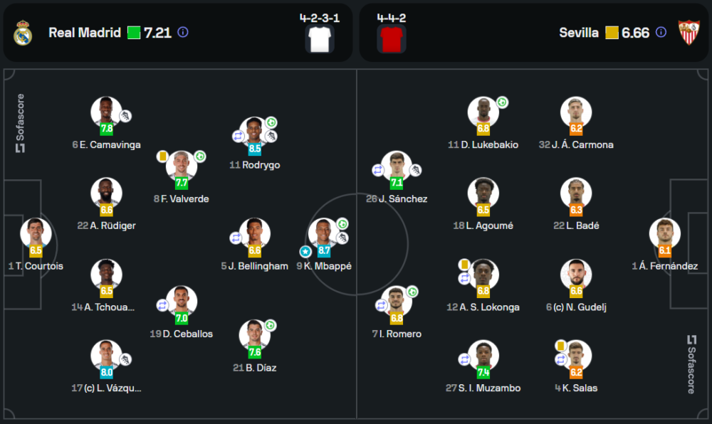 แม้เซบีย่าจะพยายามเปิดเกมบุกเพื่อลดช่องว่าง แต่เรอัล มาดริดยังคงเฉียบขาด ในนาทีที่ 53 บราอิม ดิอาซ ยิงประตูที่สี่จากการแอสซิสต์ของ คีเลียน เอ็มบัปเป้ ช่วยให้เจ้าบ้านทิ้งห่าง 4-1 ก่อนที่เซบีย่าจะทำประตูปลอบใจในนาทีที่ 85 จาก โดดี้ ลูเคบากิโอ จบเกมด้วยชัยชนะของราชันชุดขาว 4-2