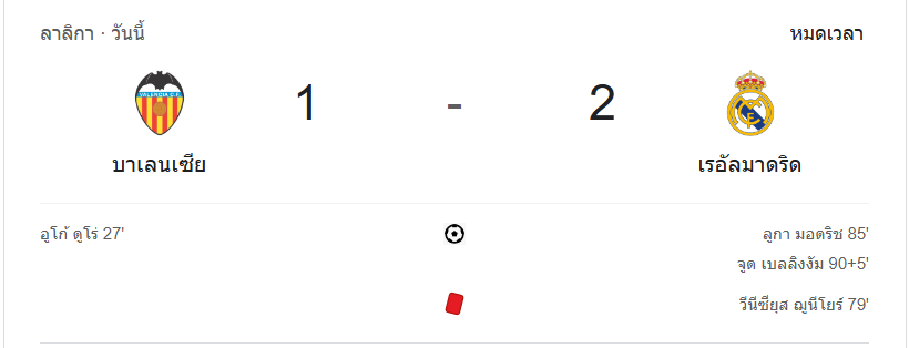 บ้านกีฬา รายงานผลบอลสดการแข่งขัน ลาลิกา 2024 ระหว่าง บาเลนเซีย และ เรอัล มาดริด ที่สนามเมสตายา เกมนี้เต็มไปด้วยความดราม่า โดยบาเลนเซียออกนำก่อนจาก ฮูโก้ ดูโร่ ก่อนที่มาดริดจะเร่งเครื่องช่วงท้ายเกม ตีเสมอจาก ลูก้า โมดริช และจบเกมด้วยการยิงของ จู๊ด เบลลิงแฮม ในช่วงทดเจ็บ ทำให้ราชันชุดขาวคว้าชัย 2-1