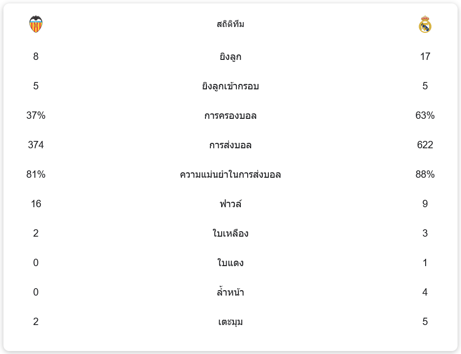 เรอัล มาดริด ครองบอลได้มากถึง 63% เทียบกับ 37% ของบาเลนเซีย และมีโอกาสยิงทั้งหมด 17 ครั้ง (เข้ากรอบ 5) ขณะที่บาเลนเซียยิงได้ 8 ครั้ง (เข้ากรอบ 5) ความแม่นยำในการส่งบอลของมาดริดอยู่ที่ 88% เมื่อเทียบกับ 81% ของเจ้าถิ่น