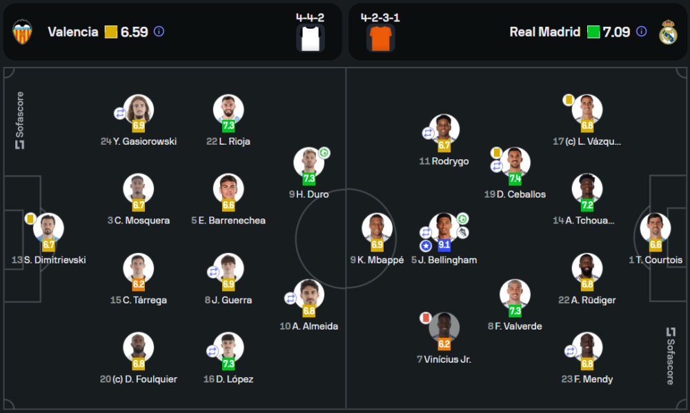 บาเลนเซียมาในระบบ 4-4-2 โดยเน้นการตั้งรับและโต้กลับเร็ว เกมรับของพวกเขาเหนียวแน่นในครึ่งแรกแต่เริ่มอ่อนล้าในครึ่งหลัง ส่วนเรอัล มาดริด ใช้แผน 4-2-3-1 โดยมีเบลลิงแฮมเป็นจุดศูนย์กลางในเกมรุก ซึ่งสามารถสร้างความแตกต่างได้ด้วยการจ่ายบอลและความสามารถเฉพาะตัว