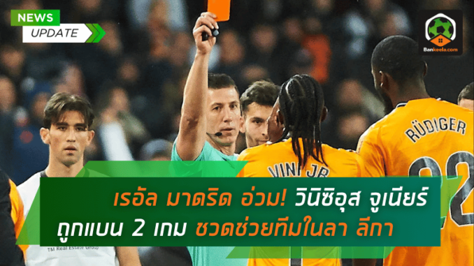 ข่าวร้ายสะเทือนถึงแฟนบอล เรอัล มาดริด เมื่อมีการยืนยันแล้วว่า วินิซิอุส จูเนียร์ ปีกตัวเก่งของทีม ถูกสั่งแบนจากการลงสนามในศึก ลา ลีกา ถึง 2 เกม หลังเจ้าตัวได้รับใบแดงโดยตรงในเกมที่ “ราชันชุดขาว” บุกเอาชนะ บาเลนเซีย 2-1 เมื่อวันศุกร์ที่ 3 มกราคมที่ผ่านมา