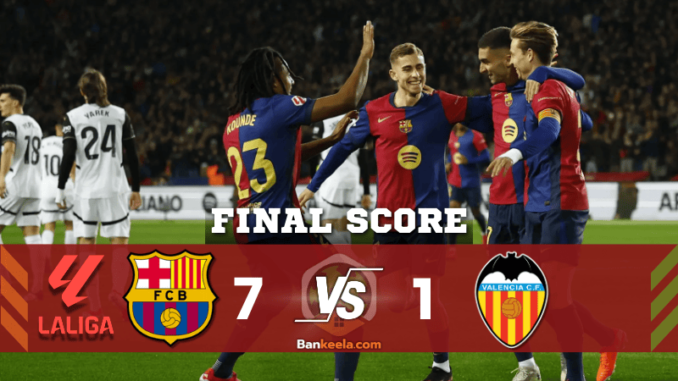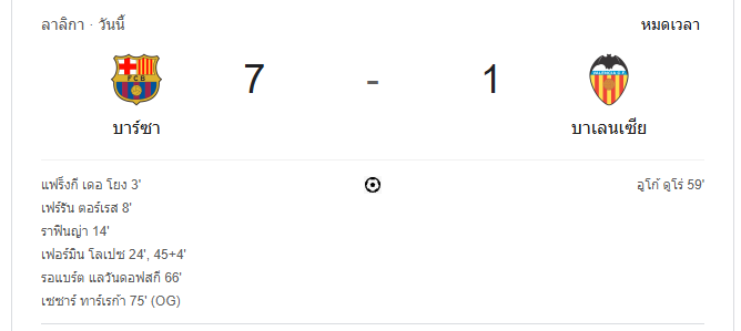 นาทีที่ 93: กรรมการเป่านกหวีดจบเกม บาร์เซโลน่าเอาชนะบาเลนเซียไปด้วยสกอร์ 7-1 ในเกมที่พวกเขาโชว์ฟอร์มได้อย่างเหนือชั้น