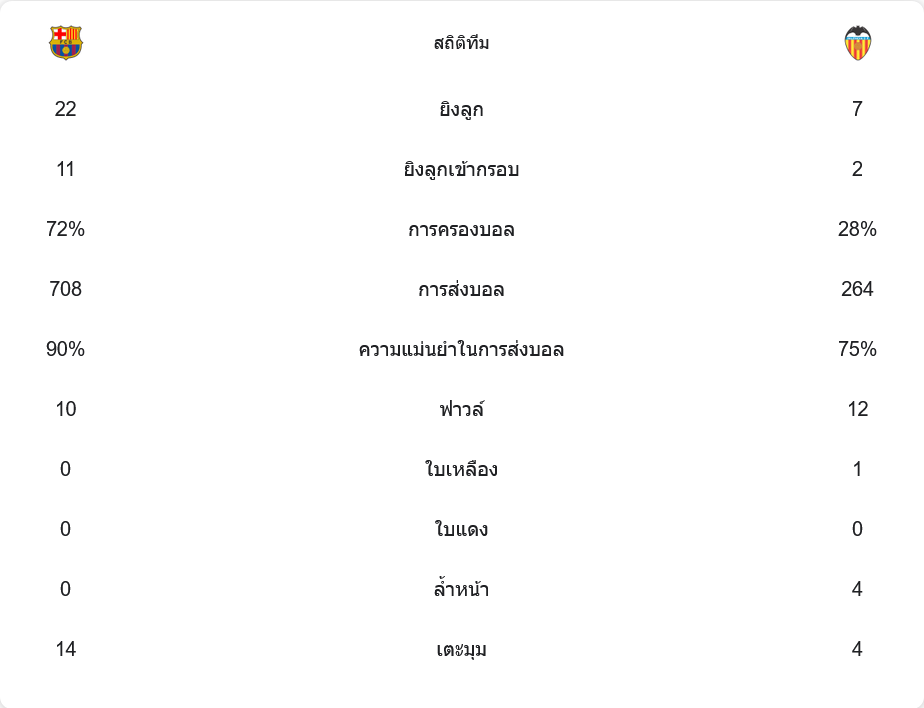บาร์เซโลน่าครองบอลมากถึง 72% มีการผ่านบอล 708 ครั้ง และความแม่นยำในการจ่ายบอลสูงถึง 90% เทียบกับบาเลนเซียที่มีเปอร์เซ็นต์ครองบอลเพียง 28% และผ่านบอลสำเร็จเพียง 264 ครั้ง ฟาวล์เกิดขึ้น 10 ครั้ง กับ 12 ครั้ง ของบาเลนเซีย มีใบเหลืองเกิดขึ้นแค่ 1 ใบ สำหรับทีมเยือน เกมนี้บาร์ซาไม่มีลูกล้ำหน้าเลยแต่ได้เตะมุมถึง 14 ครั้ง เทียบกับ 4 ครั้ง ของบาเลนเซีย