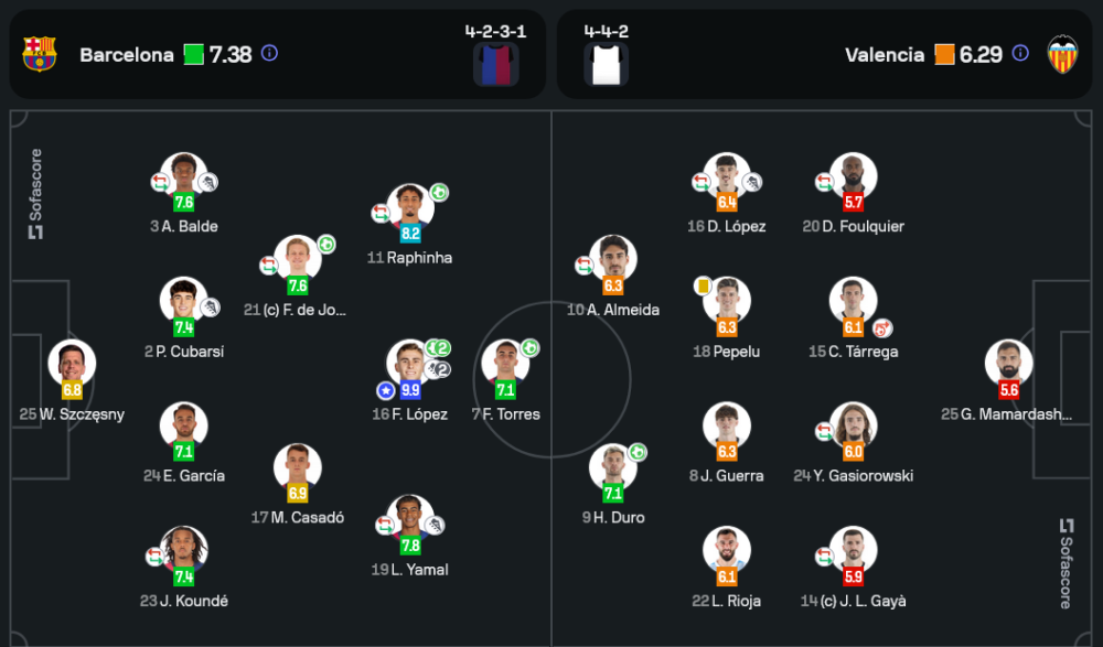 ตัวสำรองที่ถูกเปลี่ยนลงสนาม: โรเบิร์ต เลวานดอฟสกี้ (แทน ราฟินญ่า), เคราร์ด มาร์ติน (แทน อเลฮานโดร บัลเด้), เฮคเตอร์ ฟอร์ต (แทน ฌูลส์ คุนเด้), เปา บิคตอร์ (แทน ลามีน ยามาล), ปาโบล ตอร์เร่ (แทน เฟรงกี้ เดอ ยอง)