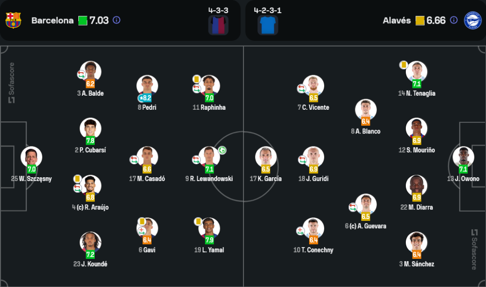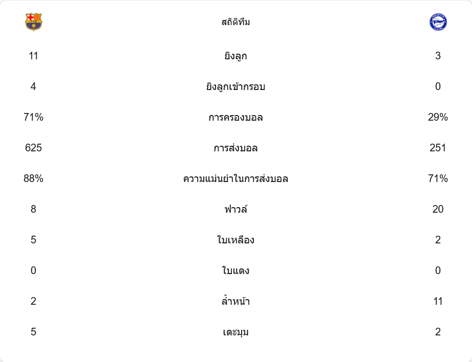 - การส่งบอล: บาร์เซโลน่า 625 ครั้ง (ความแม่นยำ 88%) – อลาเบส 251 ครั้ง (ความแม่นยำ 71%)