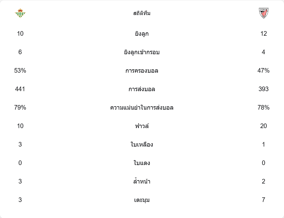 เรอัล เบติส ครองบอลได้ 53% เทียบกับ แอธเลติก บิลเบา ที่ครองบอล 47% โดย เบติส ยิงทั้งหมด 10 ครั้ง เข้ากรอบ 6 ครั้ง ส่วน บิลเบา ยิง 12 ครั้ง เข้ากรอบ 4 ครั้ง การส่งบอลของเบติสอยู่ที่ 441 ครั้ง ความแม่นยำ 79% ขณะที่บิลเบาส่งบอล 393 ครั้ง ความแม่นยำ 78% ฟาวล์ทั้งหมด 30 ครั้ง โดยบิลเบาทำฟาวล์มากถึง 20 ครั้ง