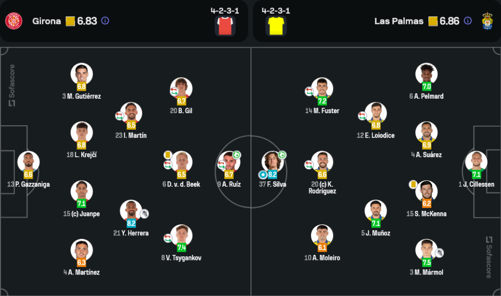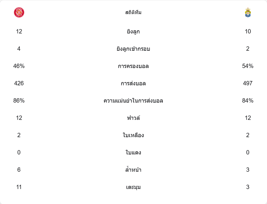 เกมนี้ ลาส พัลมาส ครองบอลได้ 54% ขณะที่ คิโรน่า ครองบอล 46% คิโรน่ายิงทั้งหมด 12 ครั้ง เข้ากรอบ 4 ครั้ง ส่วนลาส พัลมาส ยิง 10 ครั้ง เข้ากรอบ 2 ครั้ง ทั้งสองทีมมีจังหวะฟาวล์เท่ากันที่ 12 ครั้ง และได้รับใบเหลืองฝั่งละ 2 ใบ คิโรน่าได้เตะมุมถึง 11 ครั้ง แสดงให้เห็นถึงความดุดันในการบุก