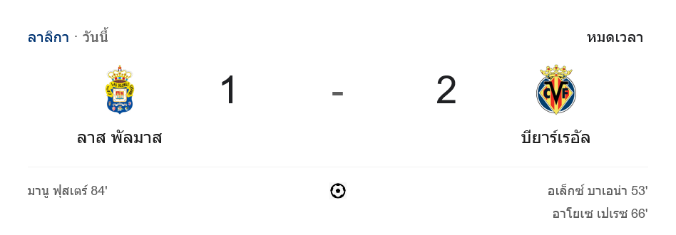 การแข่งขันฟุตบอล ลา ลีกา สเปน ฤดูกาล 2024-25 คู่ระหว่าง ลาส พัลมาส เปิดบ้านรับมือ บียาร์เรอัล จบลงด้วยชัยชนะของทีมเยือน 2-1 หลังจากเกมเต็มไปด้วยจังหวะเข้าปะทะหนักหน่วงและการเข้าทำที่เฉียบคม โดย อเล็กซ์ บาเอน่า เป็นคีย์แมนสำคัญที่ช่วยให้ทีมคว้าชัย บ้านผลบอล รายงานว่าเกมนี้ส่งผลให้ “เรือดำน้ำสีเหลือง” ขยับขึ้นมามี 40 คะแนน รั้งอันดับ 5 ของตาราง ขณะที่ ลาส พัลมาส ยังต้องดิ้นรนเพื่อหนีโซนอันตรายต่อไป