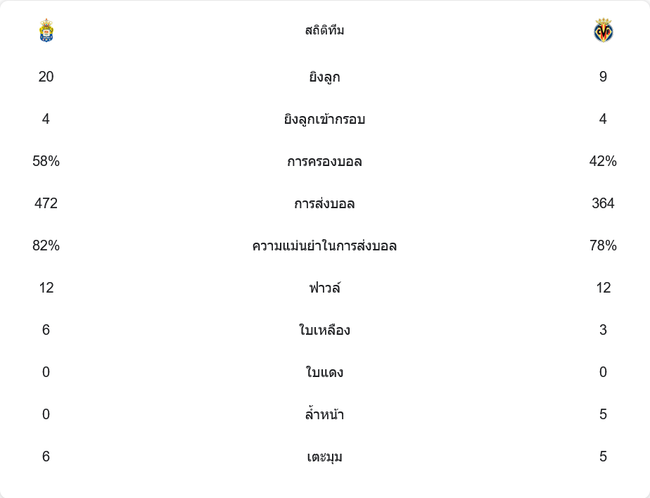 แม้ลาส พัลมาสจะยิงมากกว่าถึง 20 ต่อ 9 แต่การจบสกอร์ยังขาดความเฉียบคม ด้านทีมเยือนแม้ยิงเพียง 9 ครั้งแต่ตรงกรอบ 4 และได้ 2 ประตู เกมรับของบียาร์เรอัลแข็งแกร่ง เสียฟาวล์น้อยกว่า (12 ต่อ 12) และได้รับใบเหลืองเพียง 3 ใบเท่านั้น เทียบกับเจ้าถิ่นที่โดนไปถึง 6 ใบ