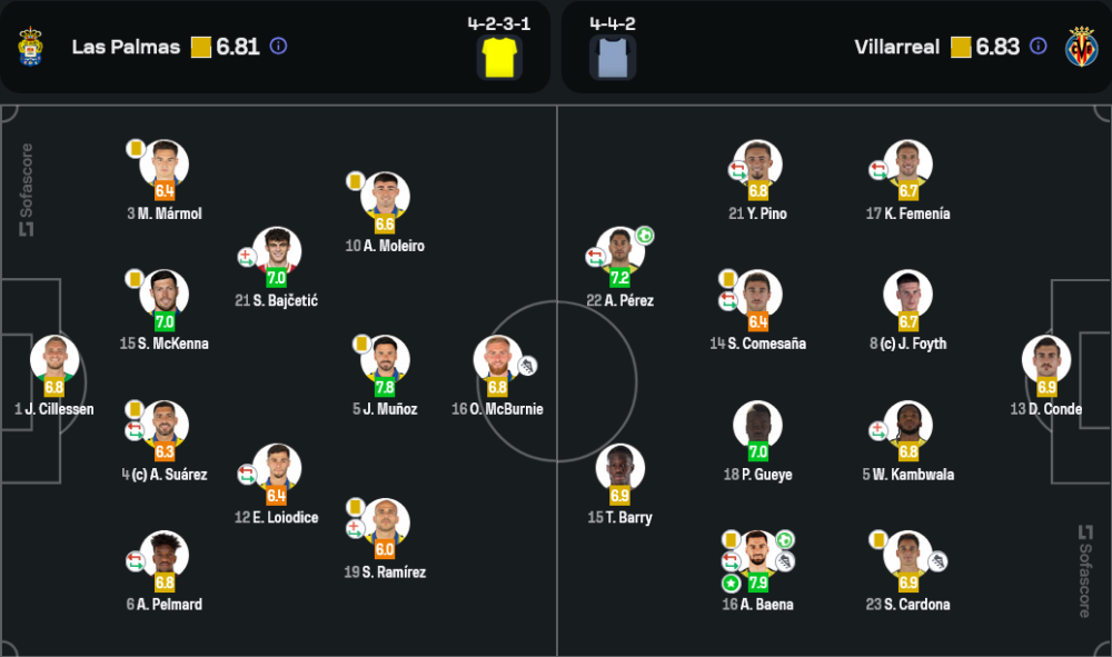 อเล็กซ์ บาเอน่า (7.9/10) – แข้งดาวรุ่งของบียาร์เรอัลโชว์ฟอร์มสุดยอดทั้งยิงทั้งจ่าย พาทีมเก็บสามแต้มสำคัญ เป็นหัวใจของเกมรุก และมีส่วนร่วมกับทุกประตูของทีม