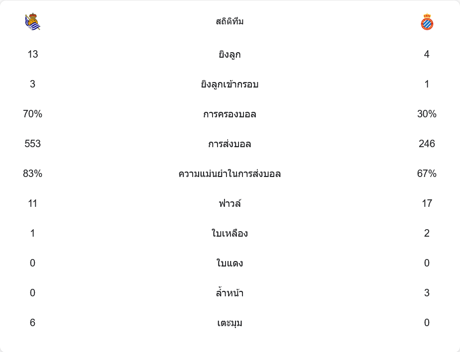 เรอัล โซเซียดัด มีโอกาสยิงถึง 13 ครั้ง และเข้ากรอบ 3 ครั้ง ขณะที่ เอสปันญ่อล ยิงเพียง 4 ครั้ง และเข้ากรอบ 1 ครั้ง เจ้าบ้านยังมีอัตราการจ่ายบอลแม่นยำสูงถึง 83% เมื่อเทียบกับทีมเยือนที่มี 67% นอกจากนี้ โซเซียดัดยังได้เตะมุมมากถึง 6 ครั้ง ขณะที่ เอสปันญ่อลไม่มีเลย