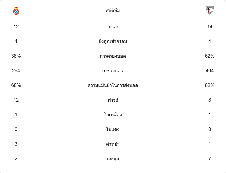 แม้ว่า เอสปันญ่อล จะมีเปอร์เซ็นต์ครองบอลเพียง 38% เทียบกับ 62% ของ แอธเลติก บิลเบา แต่พวกเขายิงได้ 12 ครั้ง เทียบกับ 14 ครั้ง ของทีมเยือน โดยทั้งสองทีมมีโอกาสยิงเข้ากรอบเท่ากันที่ 4 ครั้ง แต่บิลเบาทำได้ดีกว่าในเรื่องการผ่านบอล 464 ครั้ง เทียบกับ 294 ครั้ง ของเจ้าบ้าน
