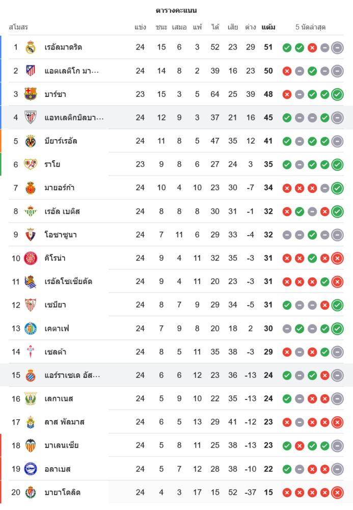 ผลเสมอทำให้ แอธเลติก บิลเบา เก็บเพิ่มเป็น 45 แต้ม ยังคงรั้งอันดับ 4 ส่วน เอสปันญ่อล มี 24 แต้ม อยู่ในอันดับ 15 ต้องเร่งเครื่องเก็บแต้มเพิ่มเพื่อหนีโซนตกชั้น