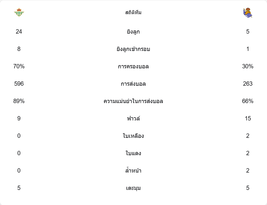 เรอัล เบติส ครองบอล 70% ยิงรวม 24 ครั้ง เข้ากรอบ 8 ครั้ง ขณะที่ เรอัล โซเซียดาด ได้ครองบอลเพียง 30% ยิงรวม 5 ครั้ง และเข้ากรอบแค่ 1 ครั้ง เกมนี้ โซเซียดาด โดนใบแดง 1 ใบ และใบเหลือง 2 ใบ