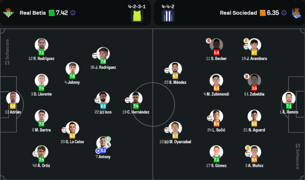 เกมนี้ เรอัล เบติส ใช้ระบบ 4-2-3-1 โดยมี อิสโก้ เป็นหัวใจของแดนกลาง การเคลื่อนที่ของ อองโตนี สร้างความแตกต่างได้อย่างชัดเจน ในขณะที่แนวรับของพวกเขาแทบไม่เปิดโอกาสให้คู่แข่งเข้าทำง่าย ๆ โซเซียดาดแม้จะมาเล่นระบบ 4-4-2 แต่การครองบอลต่ำเพียง 30% ทำให้พวกเขาต้องตั้งรับเกือบตลอดเวลา