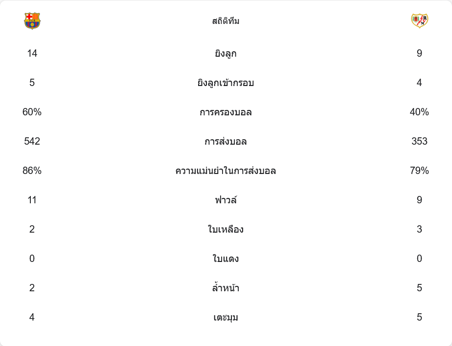 การส่งบอล บาร์ซ่า 542 ครั้ง ราโย่ 353 ครั้ง
