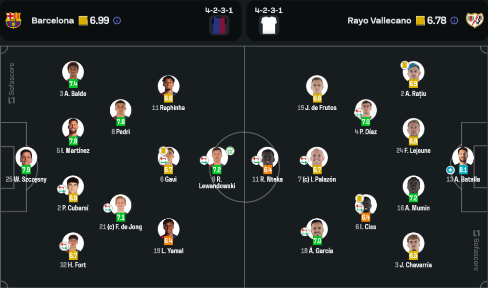 • กองกลาง: เฟรงกี้ เดอ ยอง (7.1), กาบี (6.7), เปดรี้ (7.8), ราฟินญ่า (6.6), ลามีน ยามาล (6.4)