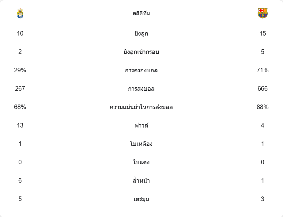 บาร์เซโลน่า ครองบอลได้ถึง 71% เทียบกับ ลาส พัลมาส ที่มีเพียง 29% ทีมเยือนจ่ายบอลสำเร็จ 666 ครั้ง ขณะที่เจ้าบ้านทำได้เพียง 267 ครั้ง