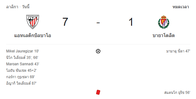 แอธเลติก บิลเบา โชว์ฟอร์มสุดแกร่ง เปิดบ้านถล่ม เรอัล บายาโดลิด ไปแบบขาดลอย 7-1 โดยมี นิโก้ วิลเลียมส์ และ อินญากี้ วิลเลียมส์ เป็นตัวหลักในแนวรุก เกมนี้บายาโดลิดต้องพบฝันร้าย หลังจากเสียผู้เล่นไป 1 คนและโดนยิงยับไม่มีโอกาสกลับมาได้เลย!