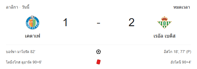 เรอัล เบติส บุกมาเฉือน เกตาเฟ่ 2-1 โดย อิสโก้ ยิงสองประตูสำคัญช่วยให้ทีมเก็บสามแต้ม ด้านเจ้าถิ่นแม้จะมีช่วงที่กดดันได้ดี แต่ท้ายเกมต้องเสีย โดมิงโกส ดูอาร์เต้ ที่โดนใบแดง ส่งผลให้ไม่สามารถตีเสมอได้ และต้องพ่ายไปในที่สุด!