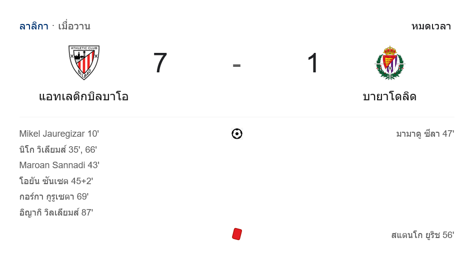 บ้านผลบอล สรุปหลังเกม แอธเลติก บิลเบา ระเบิดฟอร์มโหด! ถล่ม เรอัล บายาโดลิด 7-1