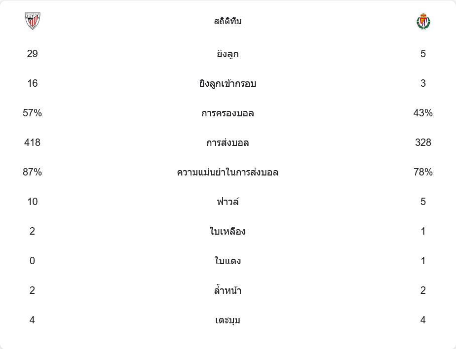 บิลเบา ครองบอลมากกว่า 57% และสร้างโอกาสยิงถึง 29 ครั้ง โดยตรงกรอบถึง 16 ครั้ง ขณะที่ บายาโดลิด มีแค่ 5 ครั้ง และตรงกรอบเพียง 3 ครั้ง แสดงให้เห็นถึงความแตกต่างด้านคุณภาพของเกมรุกชัดเจน