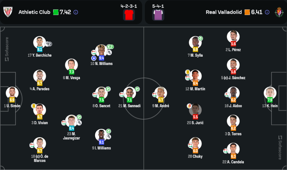 🏅 นิโก้ วิลเลียมส์ (9.4) – ยิง 2 จ่าย 2 เป็นทุกอย่างของเกมรุกบิลเบา