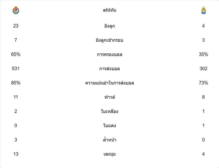 เกมนี้ เรอัล บายาโดลิด เป็นฝ่ายครองบอลเหนือกว่าที่ 65% ขณะที่ ลาส พัลมาส มีแค่ 35% เท่านั้น อย่างไรก็ตาม แม้ทีมเจ้าถิ่นจะครองบอลมากกว่า แต่พวกเขากลับเจาะแนวรับของทีมเยือนได้ไม่ง่ายนัก โดยสามารถยิงทั้งหมด 23 ครั้ง แต่เข้ากรอบเพียง 7 ครั้ง ขณะที่ ลาส พัลมาส มีโอกาสยิงเพียง 4 ครั้ง แต่ตรงกรอบถึง 3 ครั้ง ซึ่งสะท้อนให้เห็นถึงความเด็ดขาดของทีมเยือนในการเปลี่ยนโอกาสเป็นประตู การจ่ายบอลของบายาโดลิดมีความแม่นยำสูงถึง 85% จากทั้งหมด 531 ครั้ง เทียบกับลาส พัลมาส ที่จ่ายบอล 302 ครั้ง และมีความแม่นยำเพียง 73% ด้านเกมรับ ลาส พัลมาส ต้องเหนียวแน่นเป็นพิเศษจากการที่พวกเขาเหลือผู้เล่น 10 คน ตั้งแต่นาทีที่ 29 ทำให้ต้องถอยลงมาเล่นเกมรับอย่างหนัก นอกจากนี้ เกมนี้มีจังหวะฟาวล์รวม 19 ครั้ง (บายาโดลิด 11 ครั้ง ลาส พัลมาส 8 ครั้ง) และใบเหลืองอีก 3 ใบ รวมถึงใบแดง 1 ใบของ สกอตต์ แม็คเคนนา ของลาส พัลมาส ซึ่งเป็นจุดเปลี่ยนสำคัญของเกม