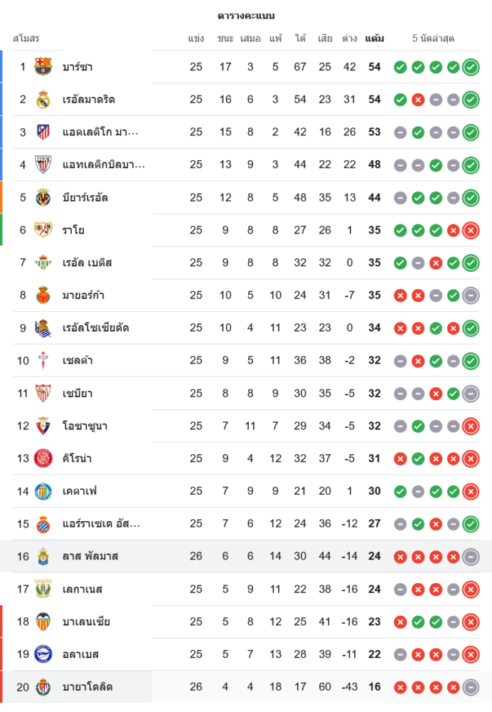 ผลเสมอทำให้ ลาส พัลมาส ขยับขึ้นมาอยู่ที่ อันดับ 16 มี 24 คะแนน ห่างจากโซนตกชั้นเพียงแต้มเดียว ขณะที่ เรอัล บายาโดลิด ยังคงรั้งท้ายตารางที่ อันดับ 20 มีเพียง 16 คะแนน สถานการณ์ยังไม่ปลอดภัย ต้องเร่งฟอร์มหากหวังอยู่รอดในลีก