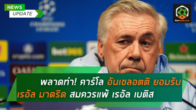 คาร์โล อันเชลอตติ กุนซือจอมเก๋าของ เรอัล มาดริด ยอมรับตรงไปตรงมาหลังจากทีมของเขาพ่ายแพ้อย่างน่าผิดหวังต่อ เรอัล เบติส ด้วยสกอร์ 1-2 ในเกม ลา ลีกา สเปน เมื่อคืนวันเสาร์ที่ผ่านมา โดยยอมรับว่าผลงานของ ราชันชุดขาว ในเกมนี้ “สมควรแพ้” และทีมเจ้าบ้านเล่นได้ดีกว่าทุกมิติ