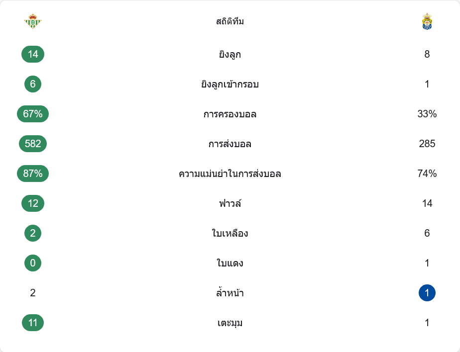 เกมนี้ เรอัล เบติส ครองบอลถึง 67% และสร้างโอกาสยิงถึง 14 ครั้ง โดยยิงเข้ากรอบ 6 ครั้ง แสดงถึงการคุมเกมและความเฉียบคมของทีม ส่วน ลาส พัลมาส ครองบอลเพียง 33% แต่ยังสร้างโอกาสยิงได้ 8 ครั้ง การป้องกันของทีมเยือนทำได้ดี แต่การเล่นที่มีผู้เล่นน้อยกว่าเป็นปัจจัยที่ทำให้พวกเขาพลาดท่าในเกมนี้