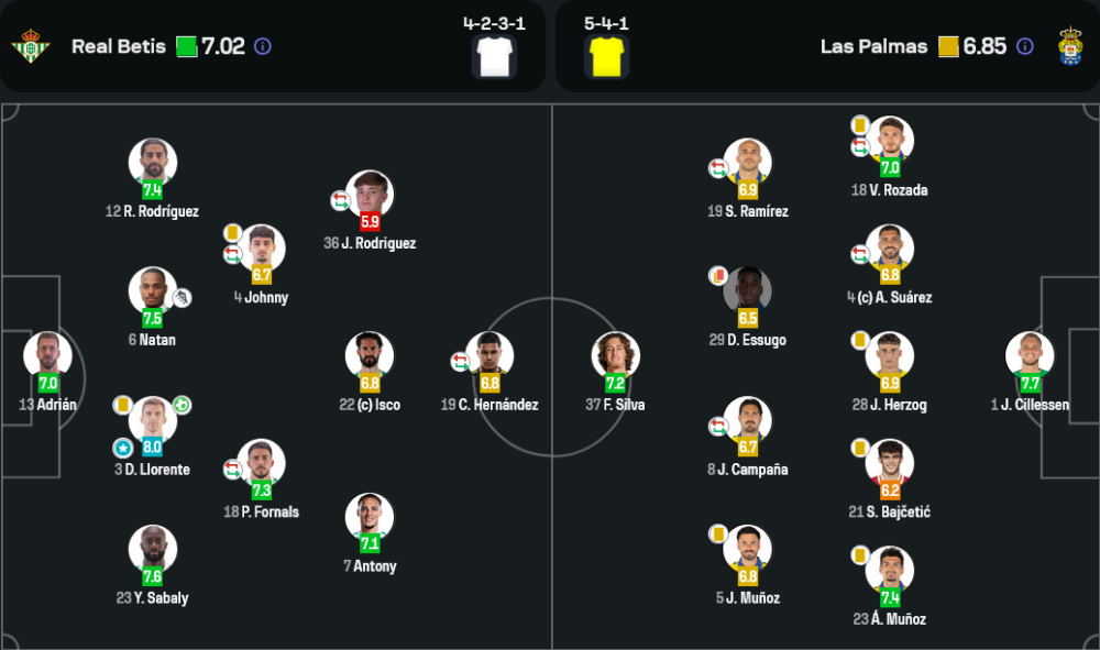 เรอัล เบติส ใช้ระบบ 4-2-3-1 เน้นการครองบอลและการจ่ายบอลสั้นๆ สร้างโอกาสจากการเล่นปีกและการทำเกมรุกจากกลางสนาม โดยเฉพาะการใช้ความเร็วของ แอนโทนี่ และความแม่นยำในการจ่ายบอลของ อิสโก้ ขณะที่ ลาส พัลมาส เลือกใช้ระบบ 5-4-1 เน้นการตั้งรับลึกและการโต้กลับเร็ว การวางแผนของทีมเยือนทำให้การป้องกันแข็งแกร่งมาก โดยเฉพาะ แจสเปอร์ ซิลเลสเซ่น ที่เซฟลูกสำคัญได้หลายครั้ง แต่การเสียใบแดงทำให้ระบบการเล่นพังลงและเปิดโอกาสให้เจ้าบ้านทำประตูชัยได้สำเร็จ