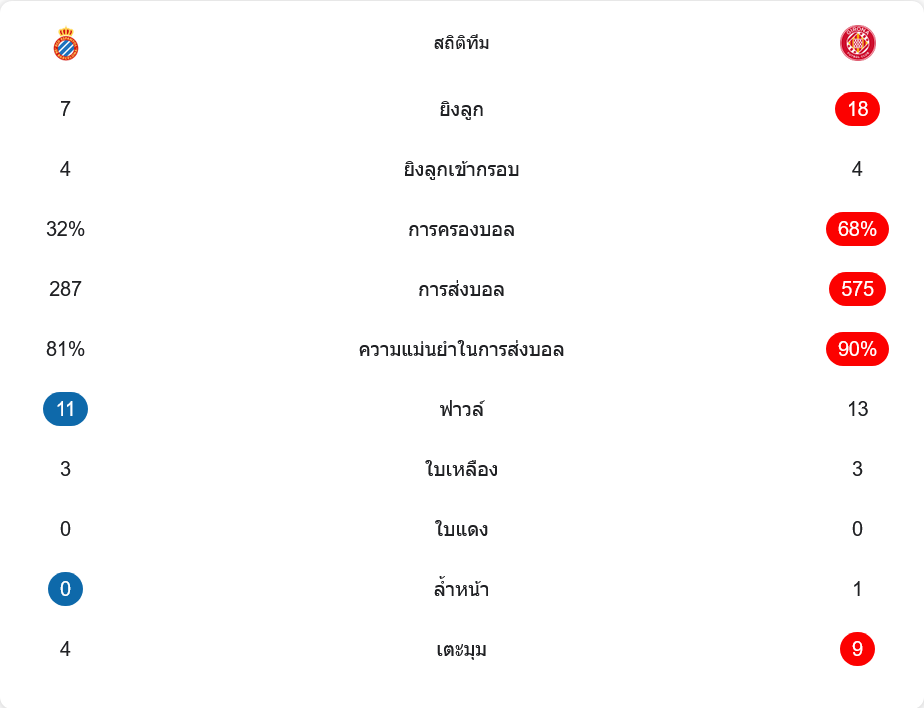 เกมนี้ คิโรน่า ครองบอลได้มากถึง 68% และมีโอกาสยิงถึง 18 ครั้ง โดยเข้ากรอบ 4 ครั้ง ขณะที่ เอสปันญ่อล มีโอกาสยิง 7 ครั้ง และเข้ากรอบ 4 ครั้งเช่นกัน แม้เจ้าบ้านจะเสียเปรียบในการครองบอล แต่เกมรับทำได้ดี และใช้การโต้กลับสร้างโอกาสได้บ้าง