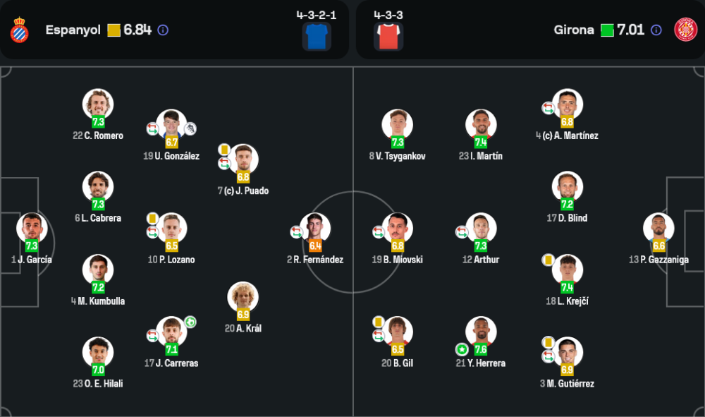 ยานเกล เอร์เรร่า (7.6) กองกลางของ คิโรน่า ที่ทำผลงานได้โดดเด่น ด้วยการครองเกมแดนกลางและสร้างโอกาสให้ทีมอย่างต่อเนื่อง
