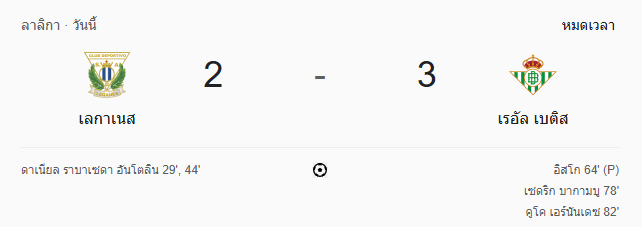 - นาทีที่ 50 กรรมการเป่าหมดครึ่งแรก เลกาเนส 2-0 เรอัล เบติส