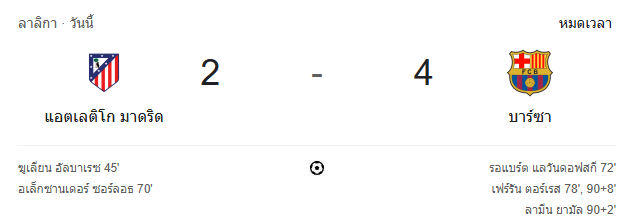 - นาทีที่ 48 กรรมการเป่าหมดครึ่งแรก แอตเลติโก มาดริด 1-0 บาร์เซโลน่า