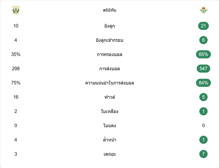 แม้ว่า เลกาเนส จะขึ้นนำก่อน แต่สถิติบ่งบอกว่า เรอัล เบติส มีเกมรุกที่ดุดันกว่าอย่างชัดเจน พวกเขาครองบอลได้ 65% เทียบกับ 35% ของเจ้าถิ่น และมีโอกาสยิงมากถึง 21 ครั้ง ขณะที่ เลกาเนส ยิงเพียง 10 ครั้งเท่านั้น ความแม่นยำในการส่งบอลของ เบติส ก็เหนือกว่าที่ 84% เมื่อเทียบกับ 75% ของเจ้าถิ่น แสดงให้เห็นถึงคุณภาพการเล่นที่แตกต่างกัน