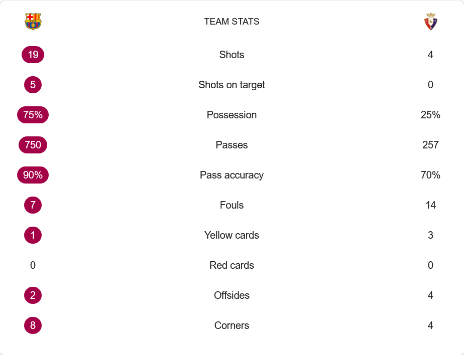 เกมนี้บาร์เซโลน่าครองบอลถึง 75% ต่อ 25% ของโอซาซูน่า พร้อมจ่ายบอลสูงถึง 750 ครั้ง ด้วยความแม่นยำระดับ 90% ขณะที่ทีมเยือนจ่ายเพียง 257 ครั้ง ความแม่นยำอยู่ที่ 70% เท่านั้น โอกาสยิงก็ห่างกันลิบลับ บาร์ซ่ายิงทั้งหมด 19 ครั้ง เข้ากรอบ 5 ส่วนโอซาซูน่ายิงได้เพียง 4 ครั้ง ไม่มีแม้แต่ครั้งเดียวที่ตรงกรอบ เกมนี้เจ้าถิ่นยังได้เตะมุมมากถึง 8 ครั้ง เทียบกับ 4 ครั้งของทีมเยือน และแม้จะเล่นเกมบุกอย่างหนัก บาร์ซ่าก็เสียฟาวล์เพียง 7 ครั้ง ขณะที่โอซาซูน่าเสียไปถึง 14 ครั้งและโดนใบเหลือง 3 ใบ
