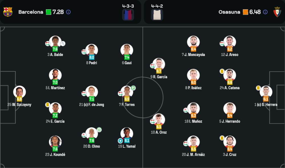 บาร์เซโลน่าภายใต้แผน 4-3-3 ของ ฮานส์-ดีเตอร์ ฟลิค ยังคงเน้นเกมบุกแบบเพรสซิ่งสูงและการต่อบอลรวดเร็วจากแดนกลาง โดยใช้ความสามารถของตัวรุกอย่าง เปดรี้, โอลโม่ และยามาล ในการเจาะแนวรับโอซาซูน่าทั้งทางริมเส้นและตรงกลาง การครองบอลเหนือกว่า 75% แสดงถึงความเหนือชั้นชัดเจน ด้านเกมรับมีความมั่นคงจาก กูนเด้ และมาร์ติเนซ ที่ยืนตำแหน่งได้ดีและเก็บบอลจังหวะสองได้หมด