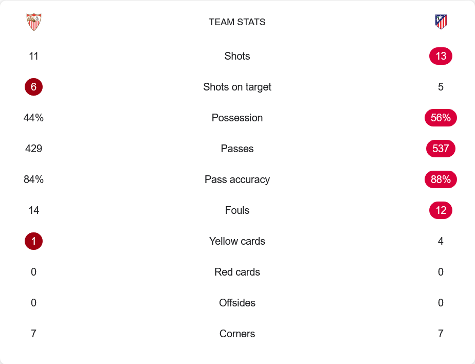 แอตเลติโก้ มาดริด มีการครองบอลมากกว่าเซบีย่าอย่างชัดเจน ด้วยอัตราการครองบอลที่ 56% และการผ่านบอลที่แม่นยำถึง 88% จากทั้งหมด 537 ครั้ง ขณะที่ เซบีย่า ทำได้เพียง 44% จากการผ่านบอล 429 ครั้ง แม้ว่าฝั่งเจ้าบ้านจะมีโอกาสยิงถึง 11 ครั้ง แต่เข้ากรอบแค่ 6 ครั้ง ขณะที่ทีมเยือนยิงไป 13 ครั้ง และเข้ากรอบ 5 ครั้ง ทำให้เห็นถึงความเฉียบคมที่แตกต่างกันอย่างชัดเจน