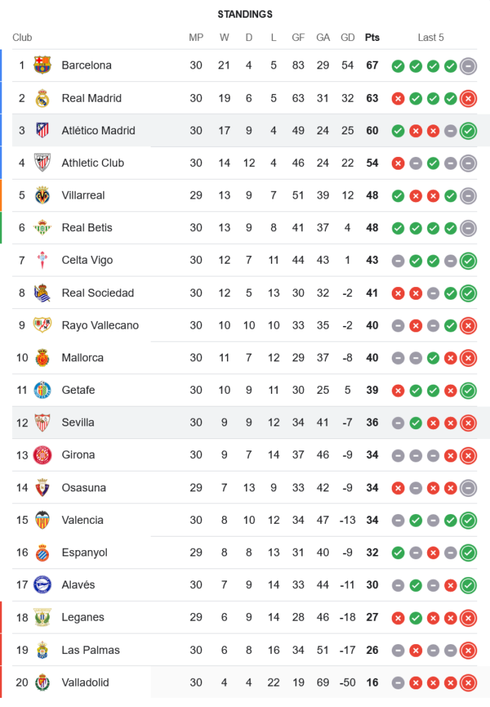 ชัยชนะครั้งนี้ส่งผลให้ แอตเลติโก้ มาดริด มี 60 คะแนน จากการลงเล่น 30 นัด รั้งอันดับที่ 3 อย่างเหนียวแน่น ขณะที่ เซบีย่า มี 36 คะแนน อยู่ในอันดับที่ 12 ของตาราง และต้องเร่งทำผลงานให้ดีขึ้นหากหวังจบในอันดับที่สูงกว่านี้