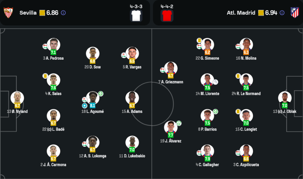 เซบีย่า ใช้ระบบ 4-3-3 เน้นการสร้างเกมจากแดนกลาง โดยมี L. Agoumé เป็นหัวใจสำคัญในการควบคุมจังหวะและส่งบอลขึ้นหน้า การใช้ตัวรุกอย่าง D. Lukebakio และ R. Vargas ทำให้เกมริมเส้นมีความเร็วและความอันตราย แต่การเจาะแนวรับของแอตเลติโก้ มาดริด ยังไม่เฉียบคมพอ