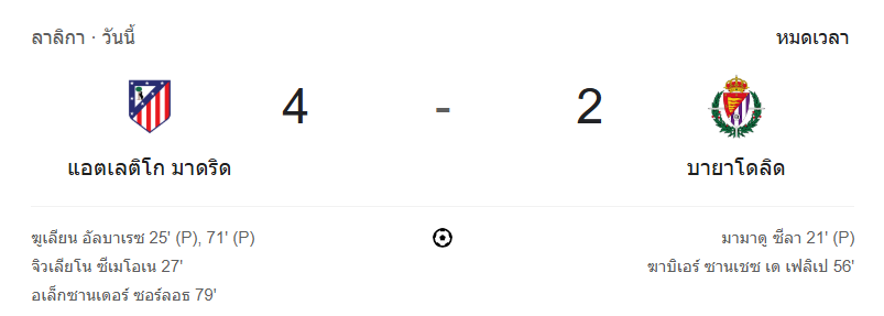 ผลบอลสด ลาลิกา 2025 ระหว่าง แอตเลติโก้ มาดริด 4-2 เรอัล บายาโดลิด วันนี้ 15/4/68
